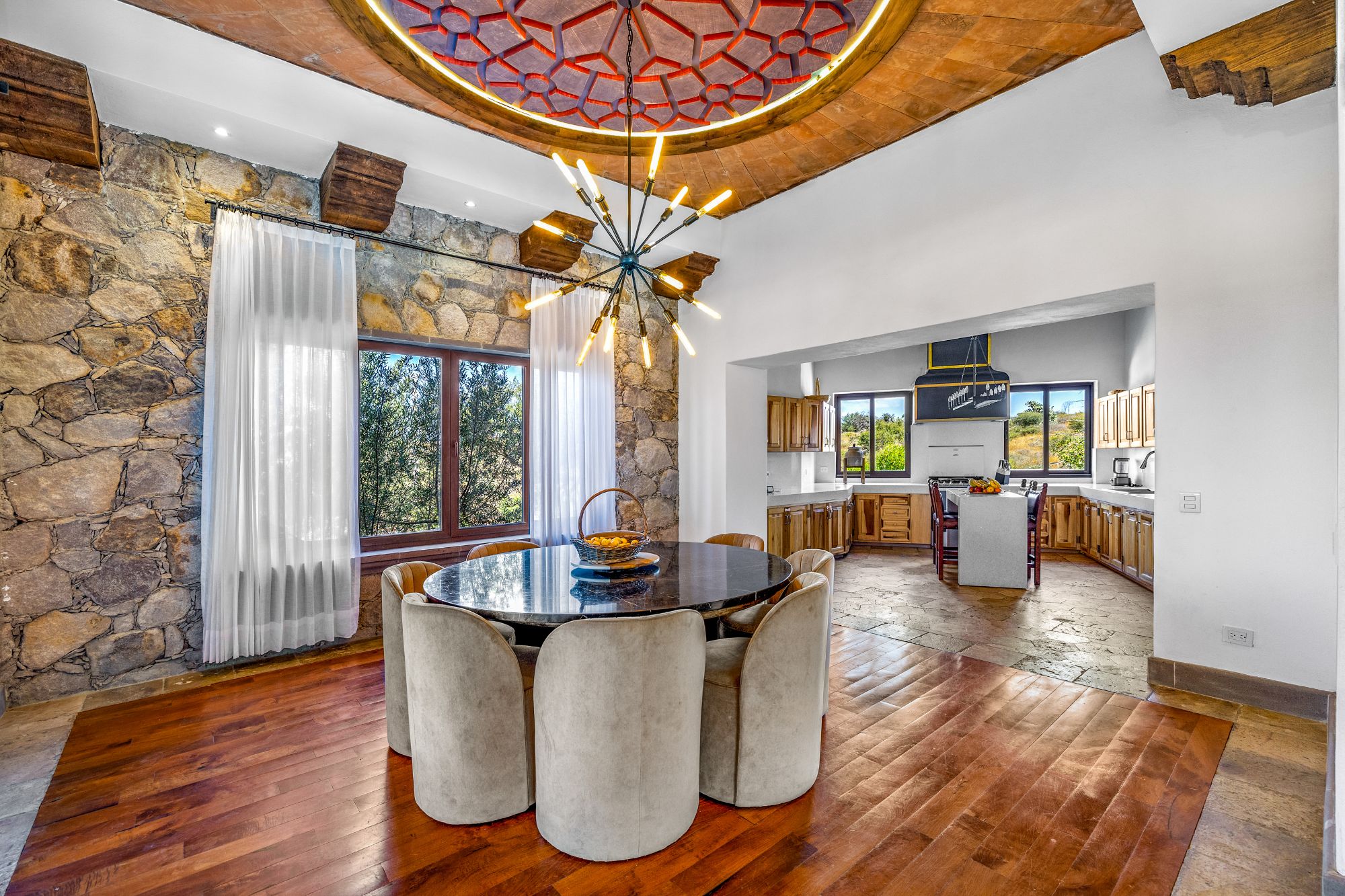 Crafted with natural materials such as stone, adobe, clay, and fine woods, including exquisite design with hardwood floors and artisanal ceilings, the home reflects exceptional craftsmanship and timeless character.